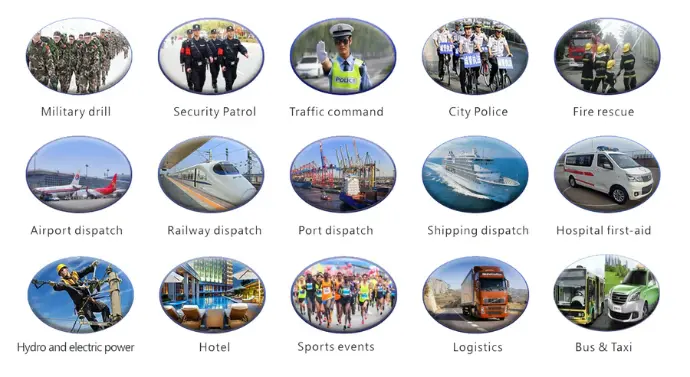 Such as Military drill; Airport dispatch; Hydro and electric power; Security Patrol; Traffic command; Railway dispatch; Port dispatch; Hotel; Sports events; City Police; Fire rescue; Shipping dispatch; Hospital first-aid; Logistics; Bus & Taxi