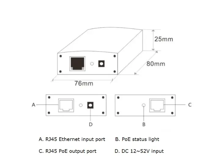 The maximum output power of single-port POE is 60W, and backward compatible with the IEEE802.3af/at PoE standard. It automatically recognizes PoE devices for power supply without damaging non-PoE devices.